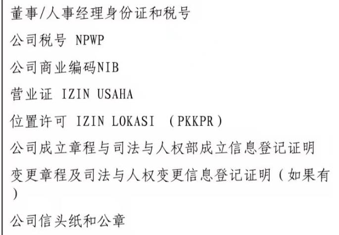 担保信需要包含以下信息 1.董事/人事经理身份证和税号 2.公司税号NPWP 3.公司商业编码NIB 4.营业证IZIN USAHA 5.位置许可IZIN LOKASI (PKKPR) 6.公司成立章程与司法与人权部成立信息登记证明变更章程及司法与人权变更信息登记证明(如果有) 7.公司信头纸和公章 注:提供电子扫描件即可查看样例