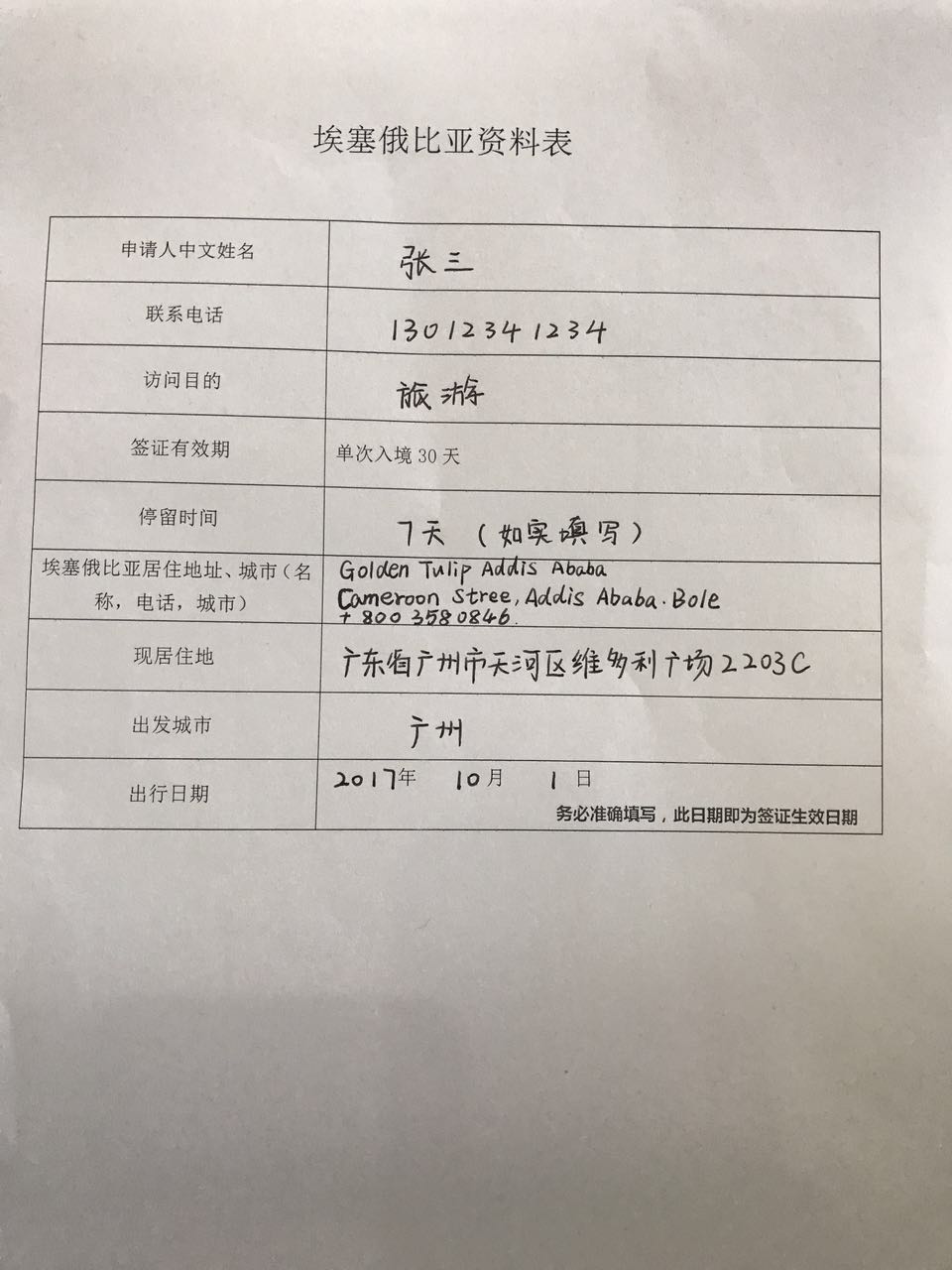 1.埃塞俄比亚需要指定生效日,预计出行日期不得早于指定生效日期,可申请停留日期不能超过30天,请务必确保指定生效时间正确。 2.由于此类别签证的网站申请不稳定,请您在签证获批之后再购买机票 3.出签后,清晰打印电子版PDF随护照一起入境(彩色/黑白均可)