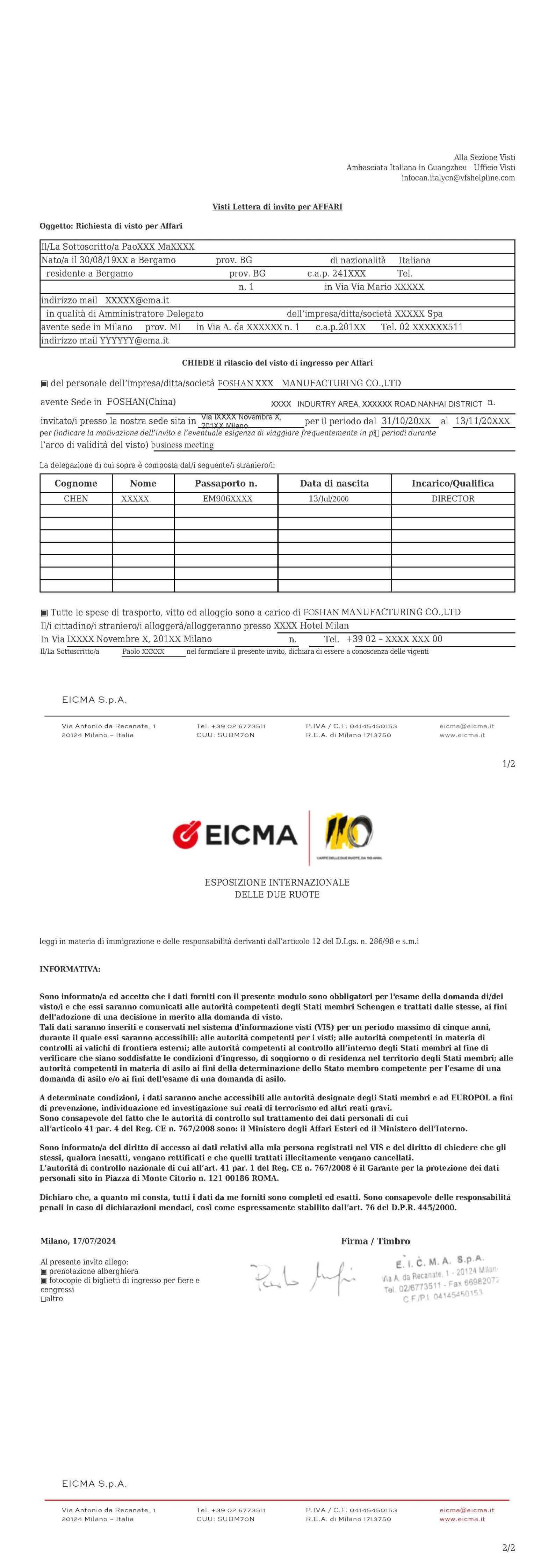 1.意大利公司邀请人护照首页与签字页信息 2.如邀请人非意大利人,还需提供有效居留卡复印件
