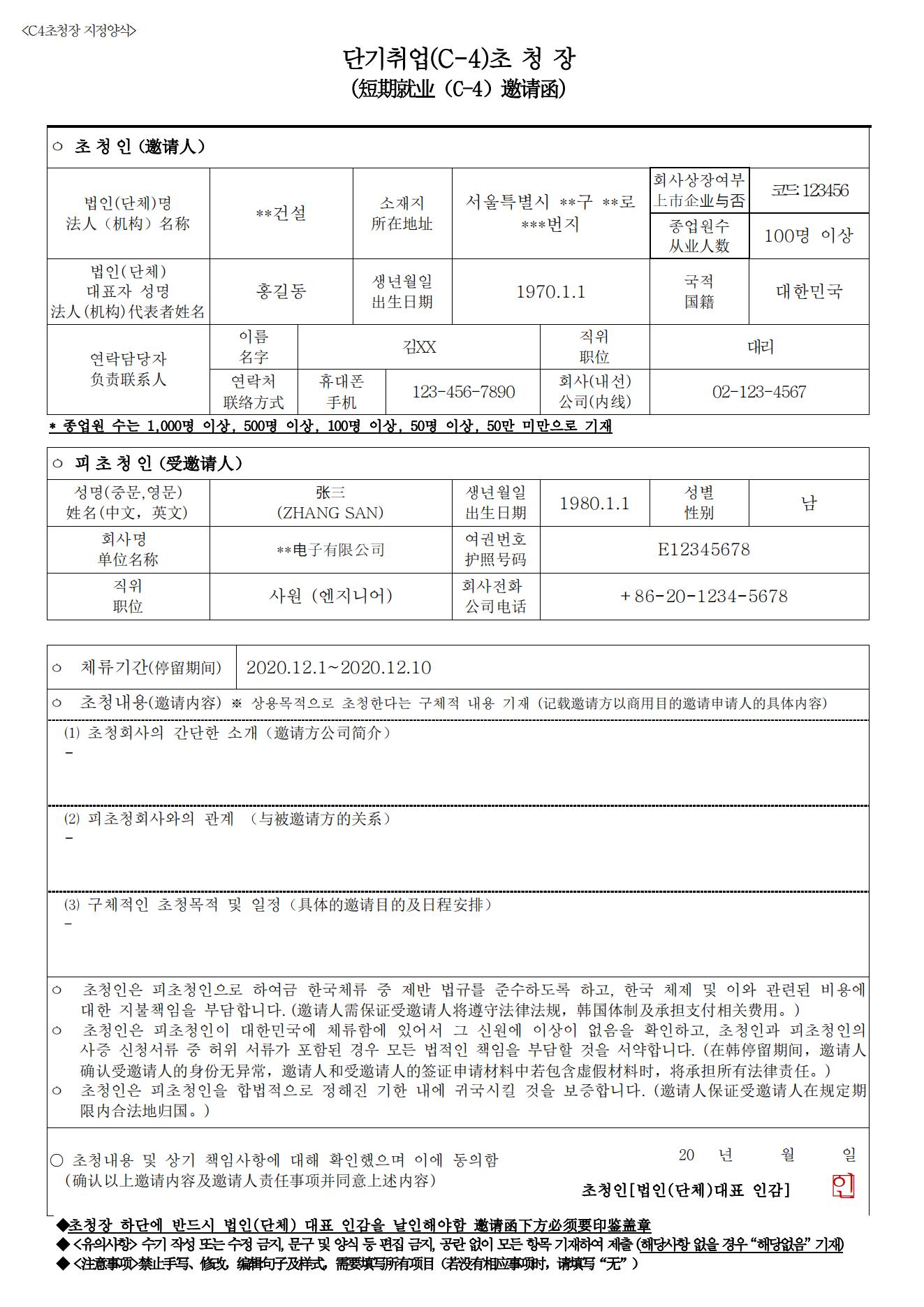 由韩国邀请公司开具,使用领馆指定模版 1.邀请函填写注意事项: (1)所有空格都必须填写,编辑后不能遮挡、删减原有内容 (2)落款日期必须机打,不能手写 (3)日程安排项须先写明访问目的,再写具体行程安排,行程时间不能中断,并注明清晰的日期 2.邀请函要求: (1)停留期30天内建议直接写周数或者天数,超过30天建议行程上分段注明日期跟行程内容(例:年月日~年月日+行程内容 ) (2)在使用电脑等设备填写时,请注意切勿变更格式 (3) 邀请函必须有邀请公司的法人印章或者公司法人的个人印鉴,两页纸以上需盖骑缝章 3.如申请人未能提供技术资格证,须由韩方另行出具一份邀请事由书(无固定格式),并提供加盖韩方公章的原件查看样例