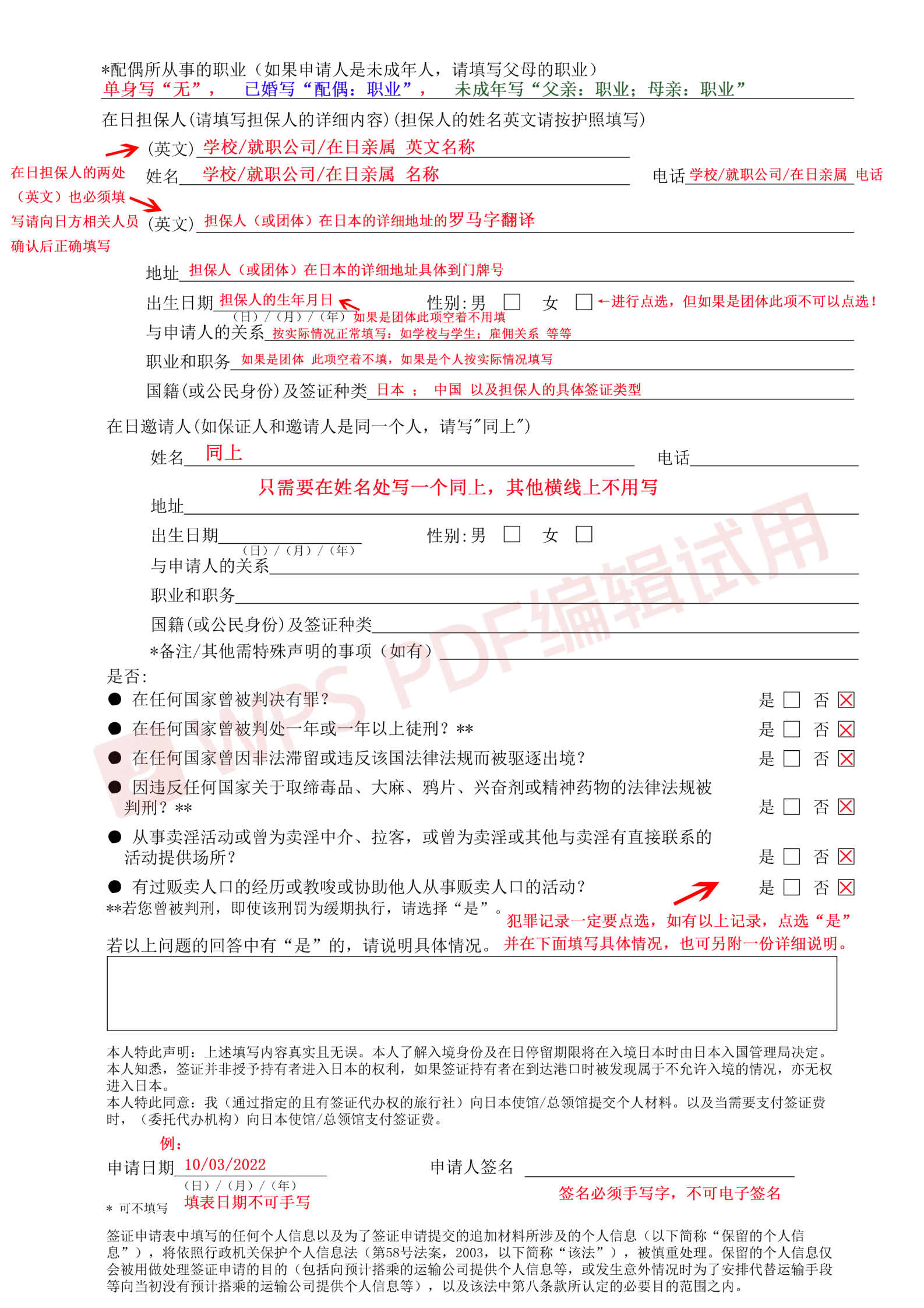 1.申请表必须单面打印,电脑编辑,中文完整填写,本人签字,字迹清晰、不得涂改 2.所有地址须具体至门牌号 (1)家庭地址须与单位地址同属一个城市(或地区),如不一致,可能需补充交通证明 (2)单位地址须为受理领区范围内 3.申请表“在日拟入住地址”栏须按“滞在”填写 4.申请表“担保人信息”栏须填写日方信息 5.入境口岸、入境日期及预定在日逗留日期须如实填写,且逗留时间不得超过“滞在”给与的期限 6.上次赴日日期及停留时间必须填写正确 7.公司电话必须填写 注:打印签字后,提供原件。以上内容必须如实填写,如发现填写不规范或信息无效,需重新提交签字表格。我司提供范例供参考查看样例