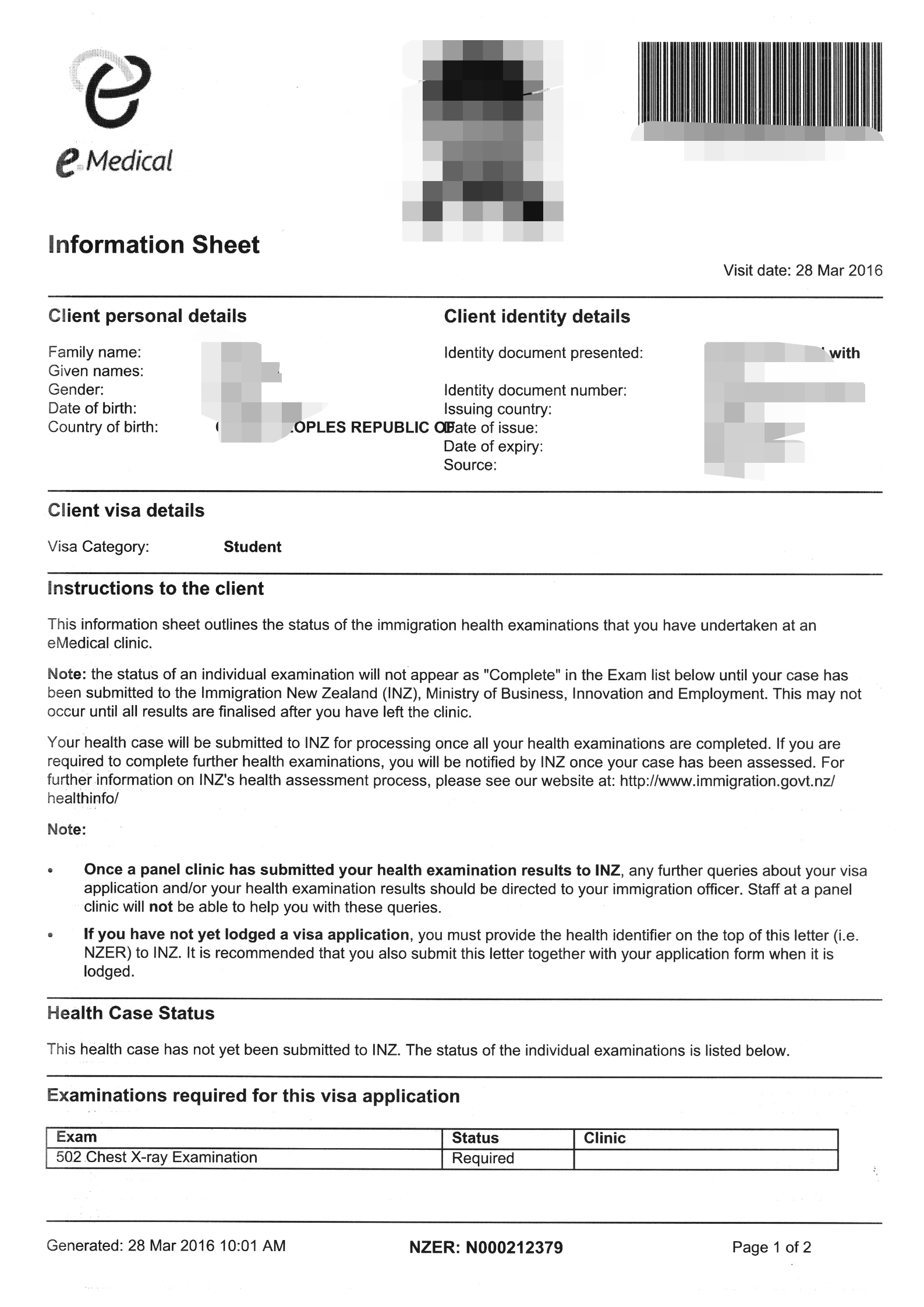 申请人可通过新西兰移民局官方网站查询所在地符合要求的指定体检机构,并提供由指定医院出具的体检回执清晰扫描件(近1年内):https://www.immigration.govt.nz/process-to-apply/applying-for-a-visa/providing-evidence-and-documents-to-support-your-visa-application/health-requirements/doctors-who-can-do-x-rays-and-medical-examinations/?page=1&filter_0=China查看样例