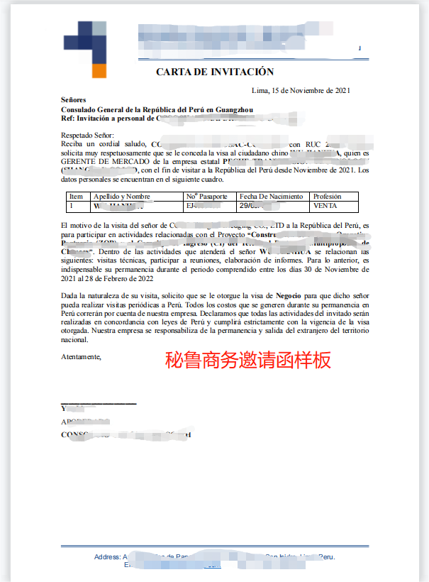 1.经公证处和秘鲁外交部认证的邀请函原件(英文或者西班牙文) 2.内容需注明:邀请公司的名称、电话、详细地址、邀请人签名及印刷体名字拼写、被邀请方公司名称及邀请人姓名及护照号码、访问期限、详细访问目的、具体的工作行程安排等相关内容 4.须由企业法人代表签字 注:参考样例为秘鲁商务邀请函/秘鲁当地公证认证样式查看样例